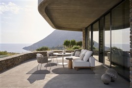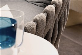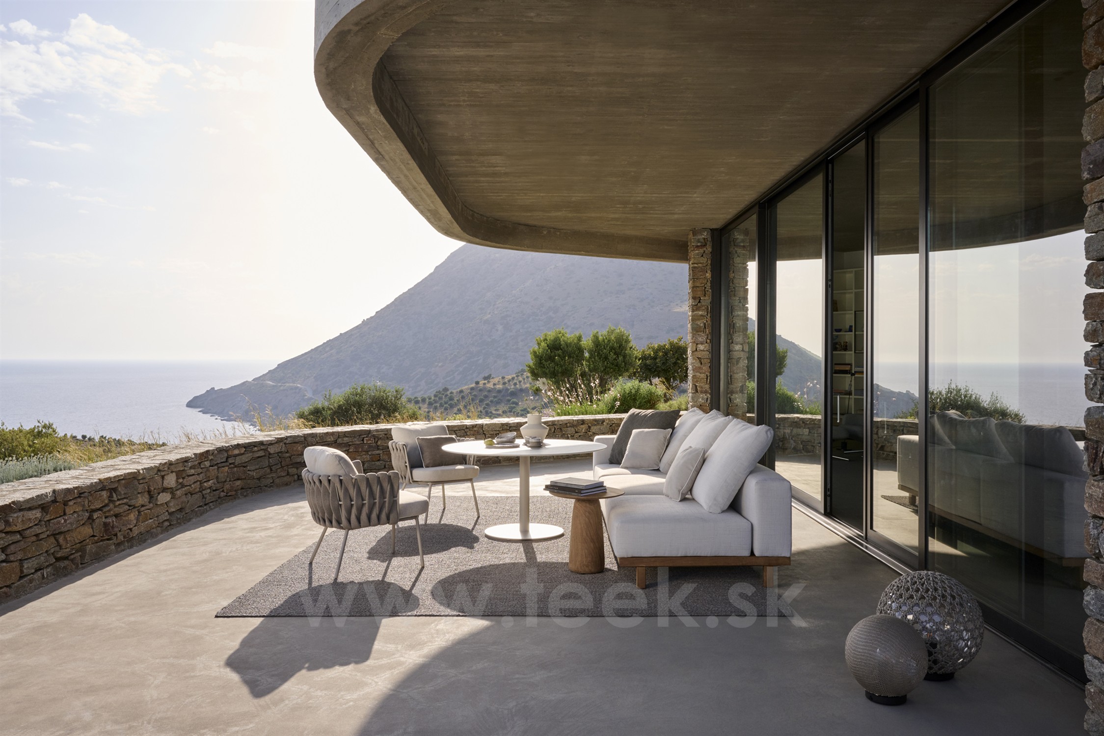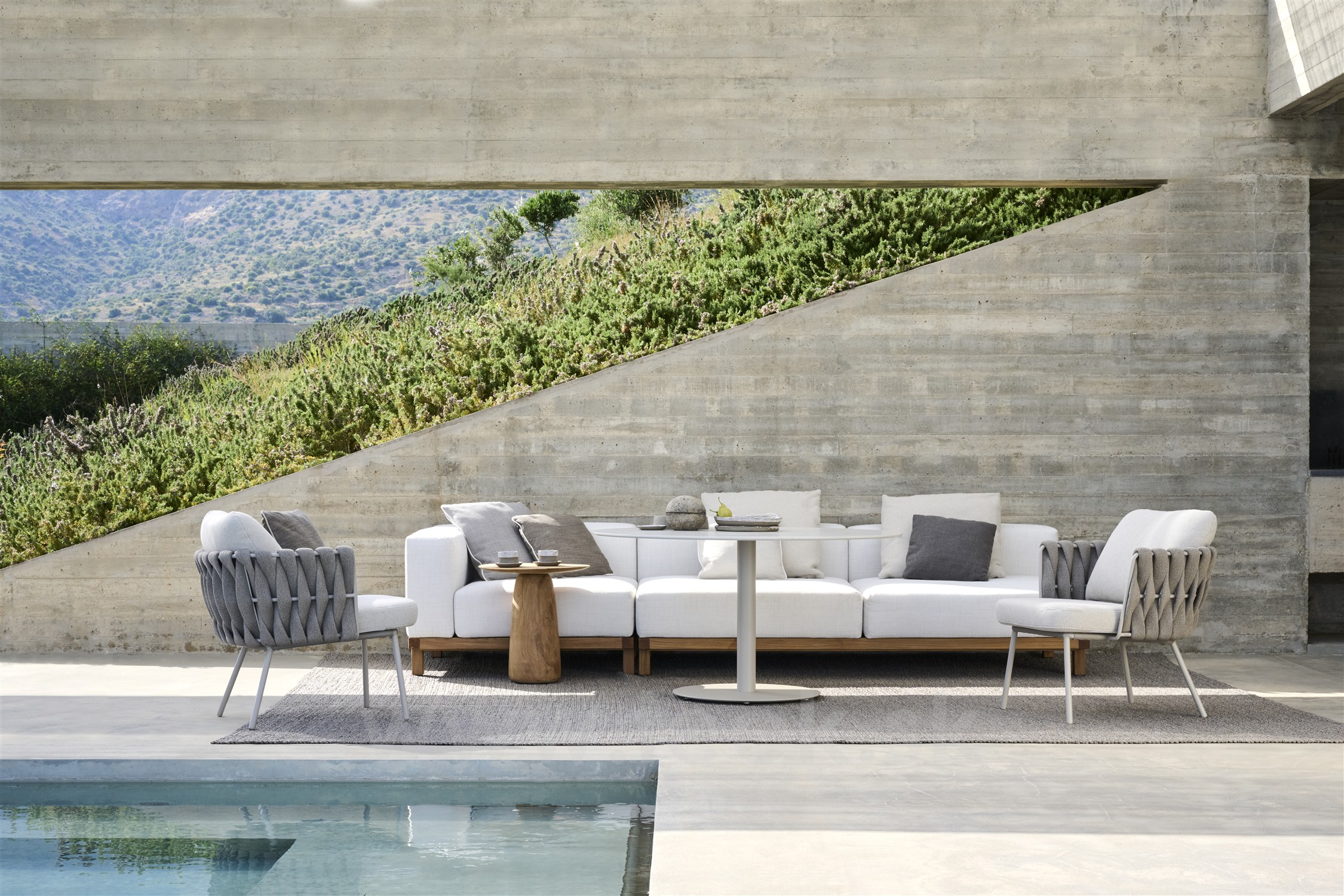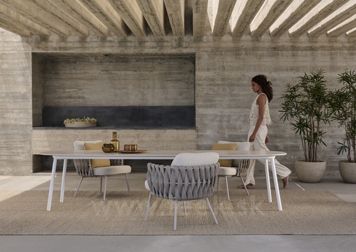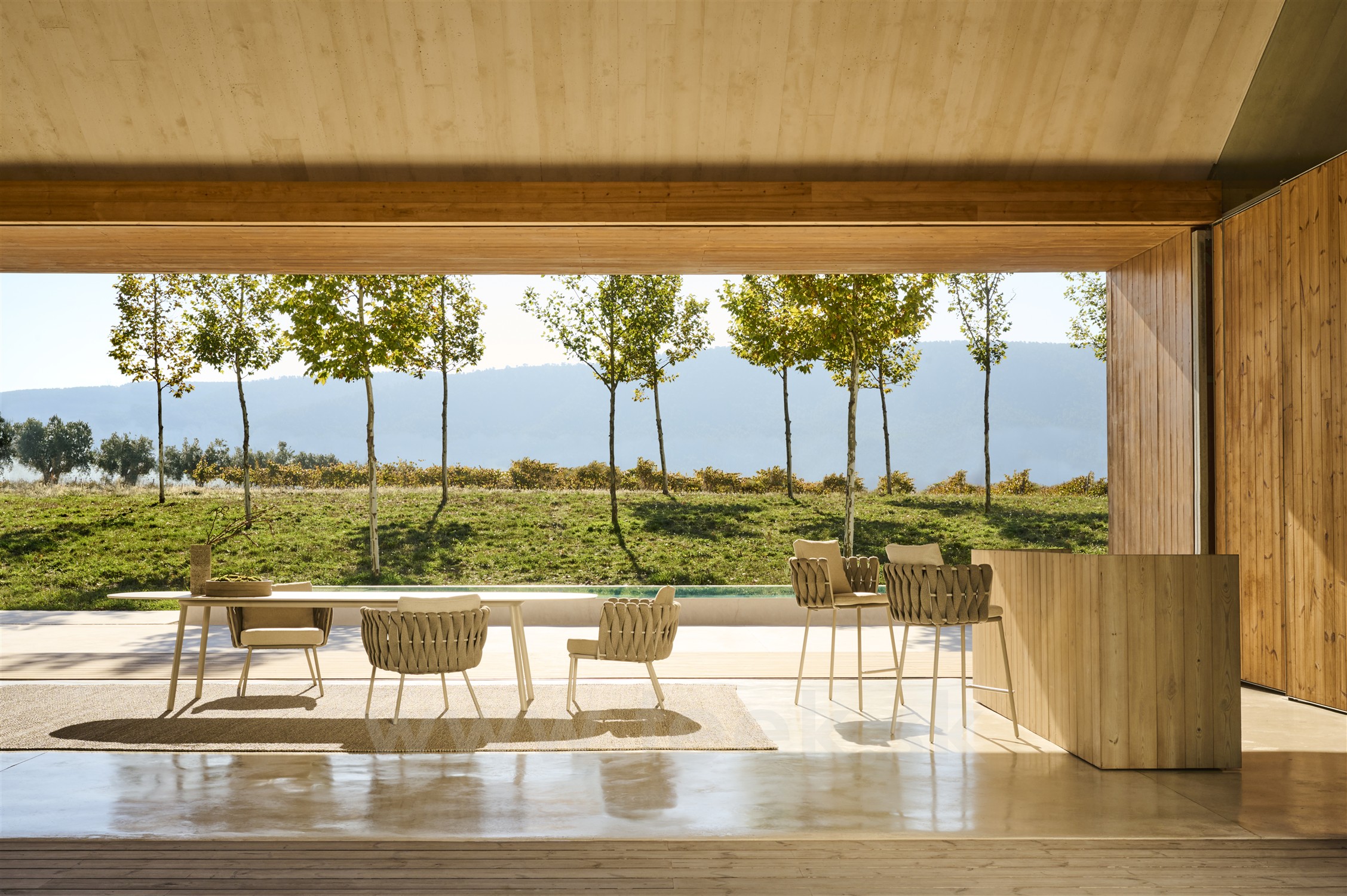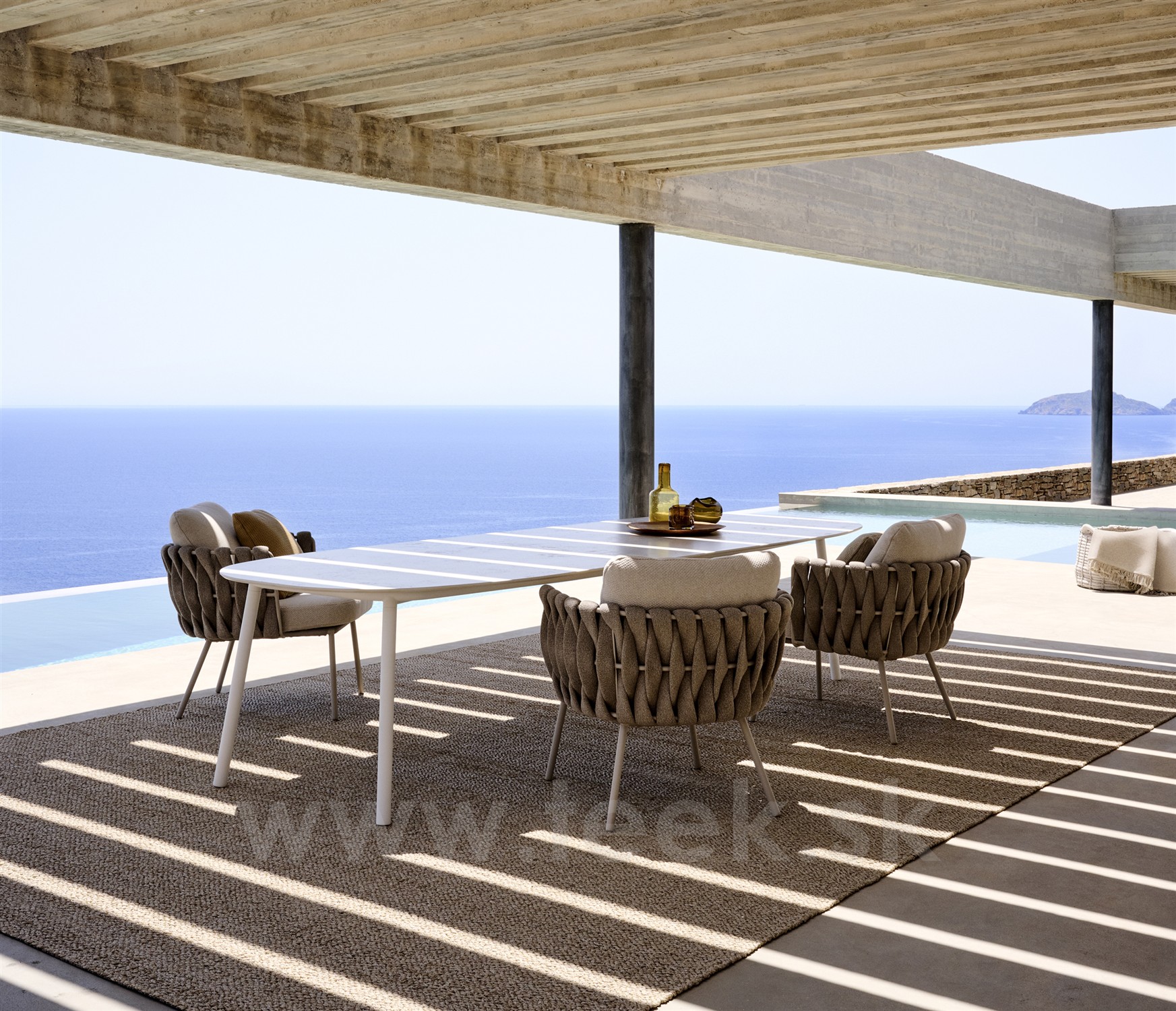 Ikonický jedálenský vonkajší nábytok Tosca značky Tribu s rámom z lakovanej nehrdzavejúcej ocele, vizuálne atraktívny plný výplet v špičkovej vonkajšej kvalite.