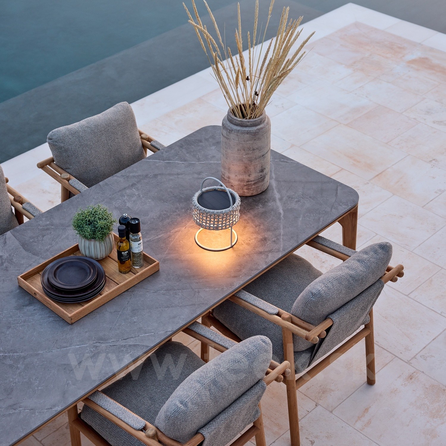 Jedálenský vonkajší stôl Aspect, Cane-line, 280x100x74 cm, rám teak, doska keramika dekor travertine