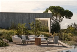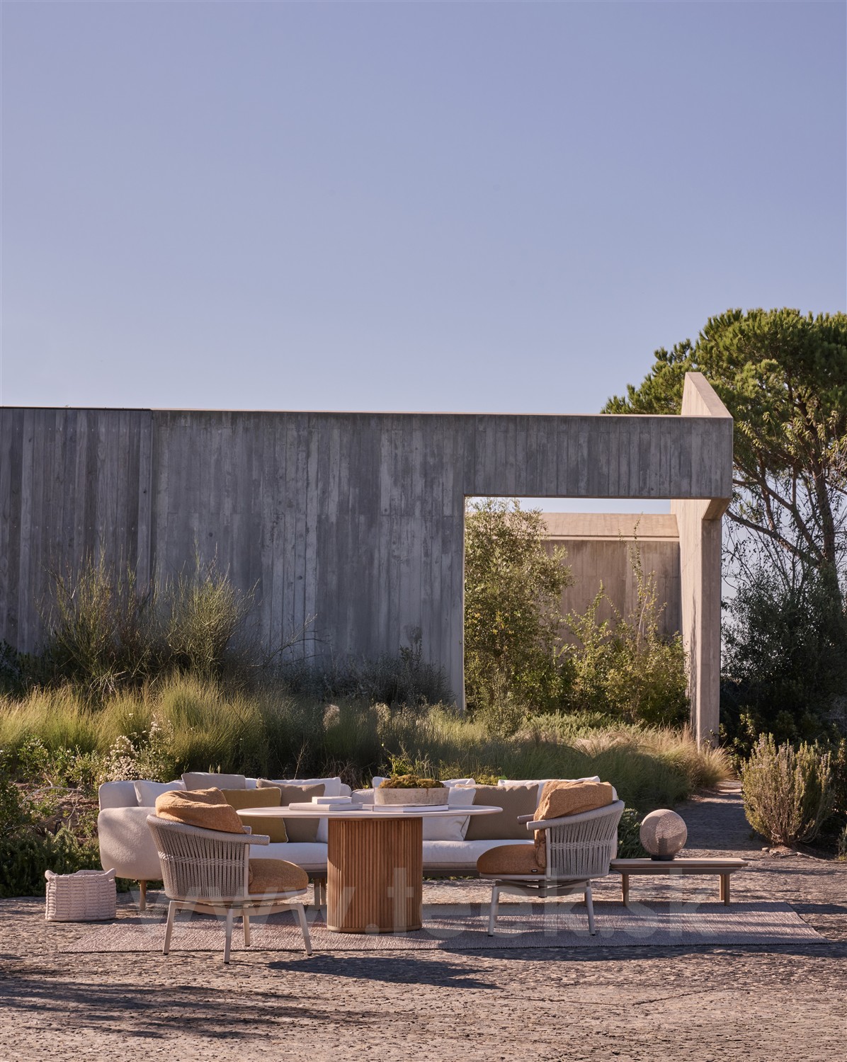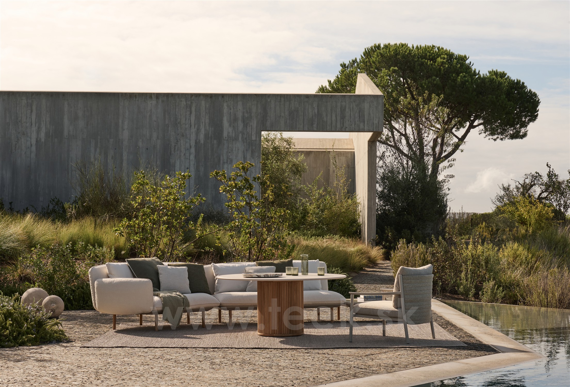 Jedálenský stôl znížený Otto, Tribu, okrúhly 148x67 cm, rám teak, doska keramika dekor sabbia