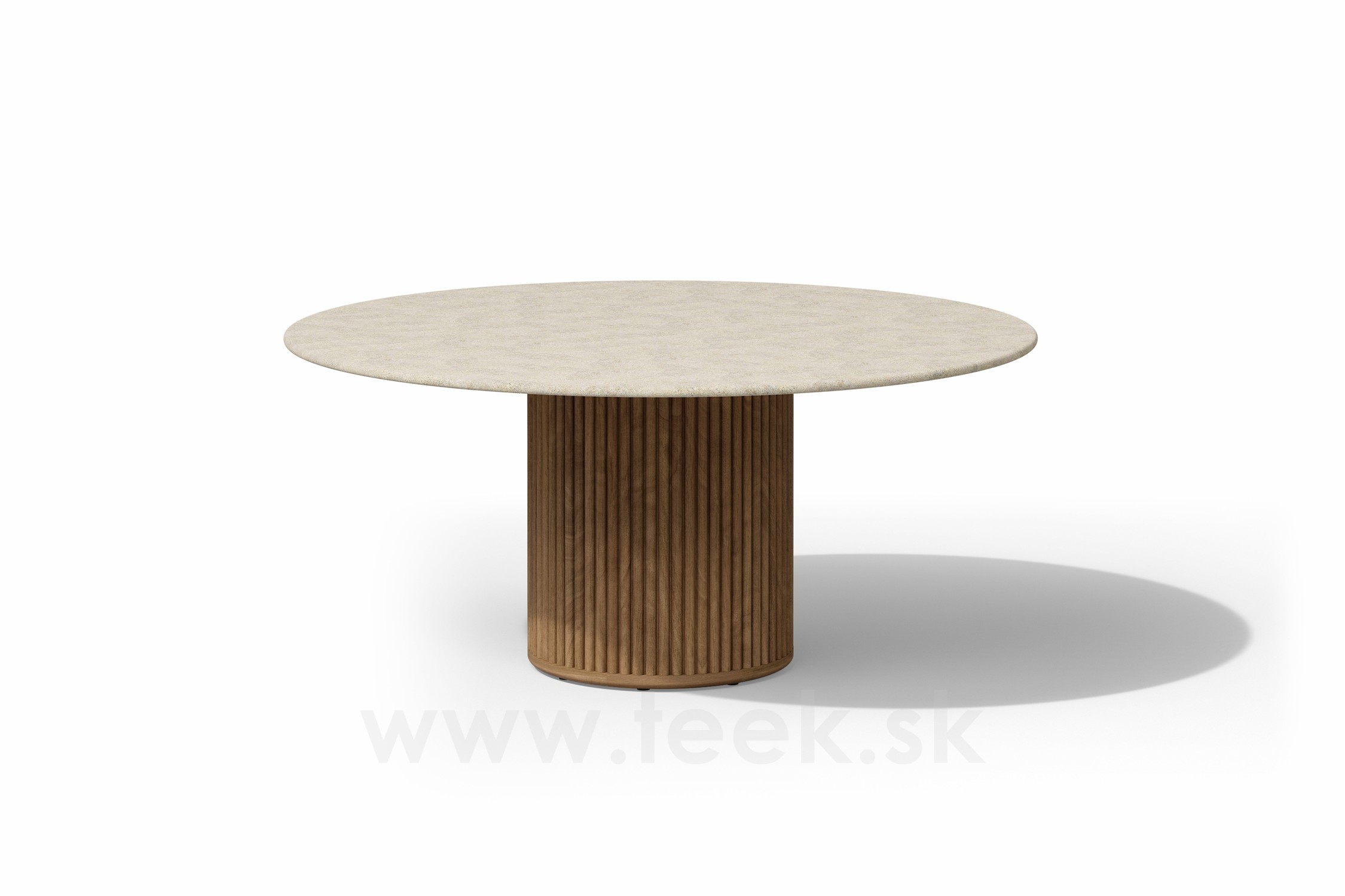 Jedálenský stôl znížený Otto, Tribu, okrúhly 148x67 cm, rám teak, doska prírodný kameň travertine