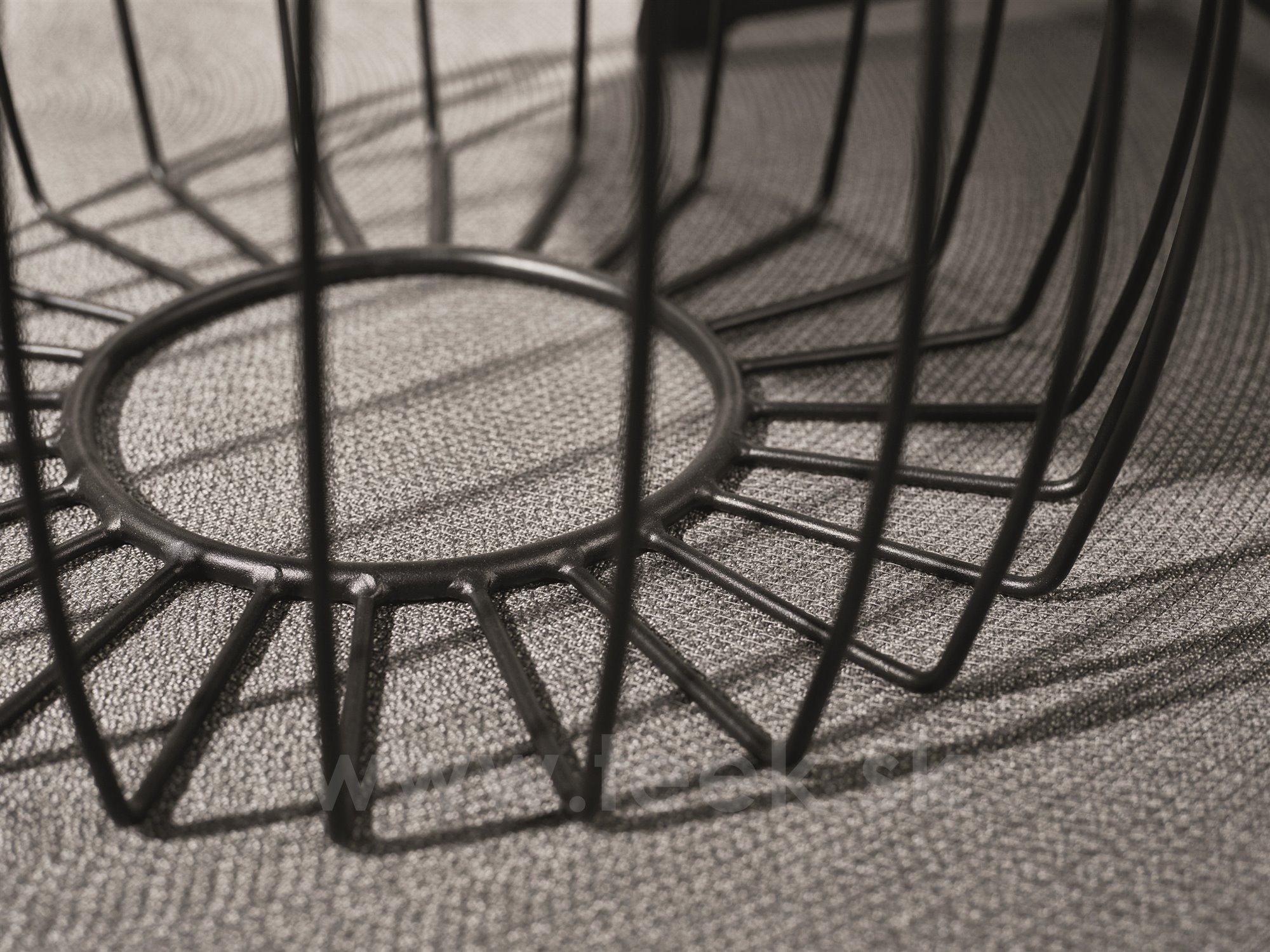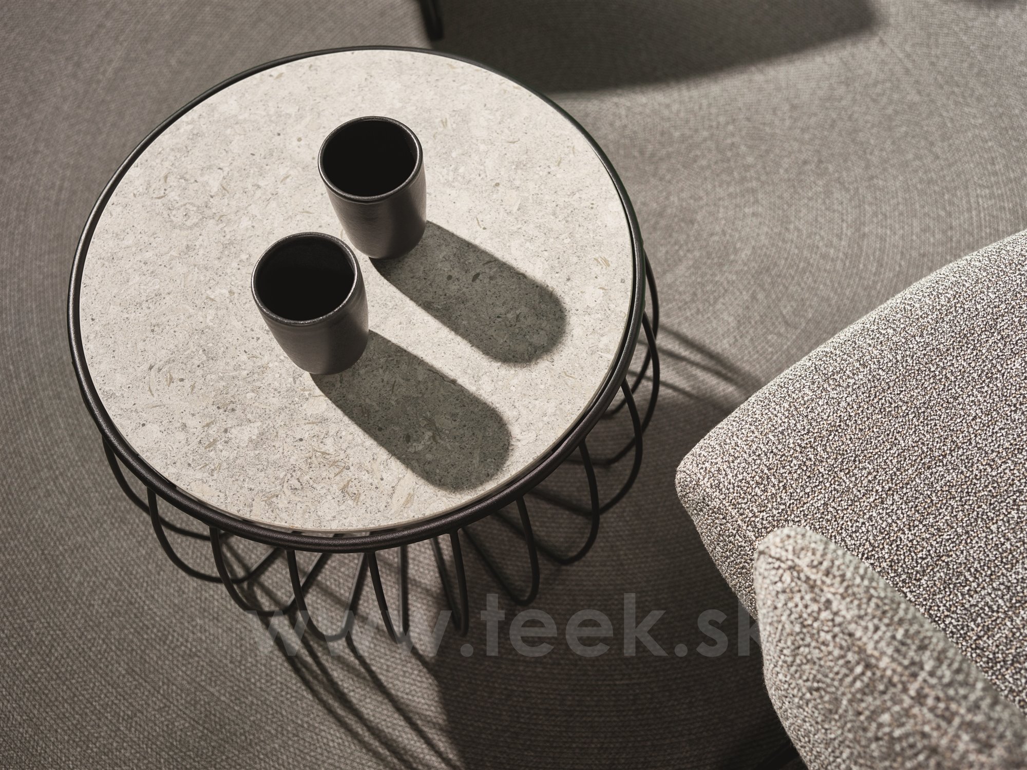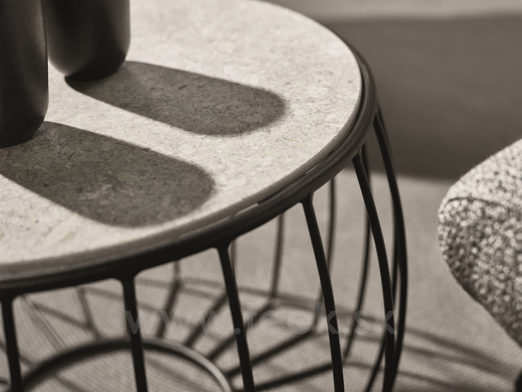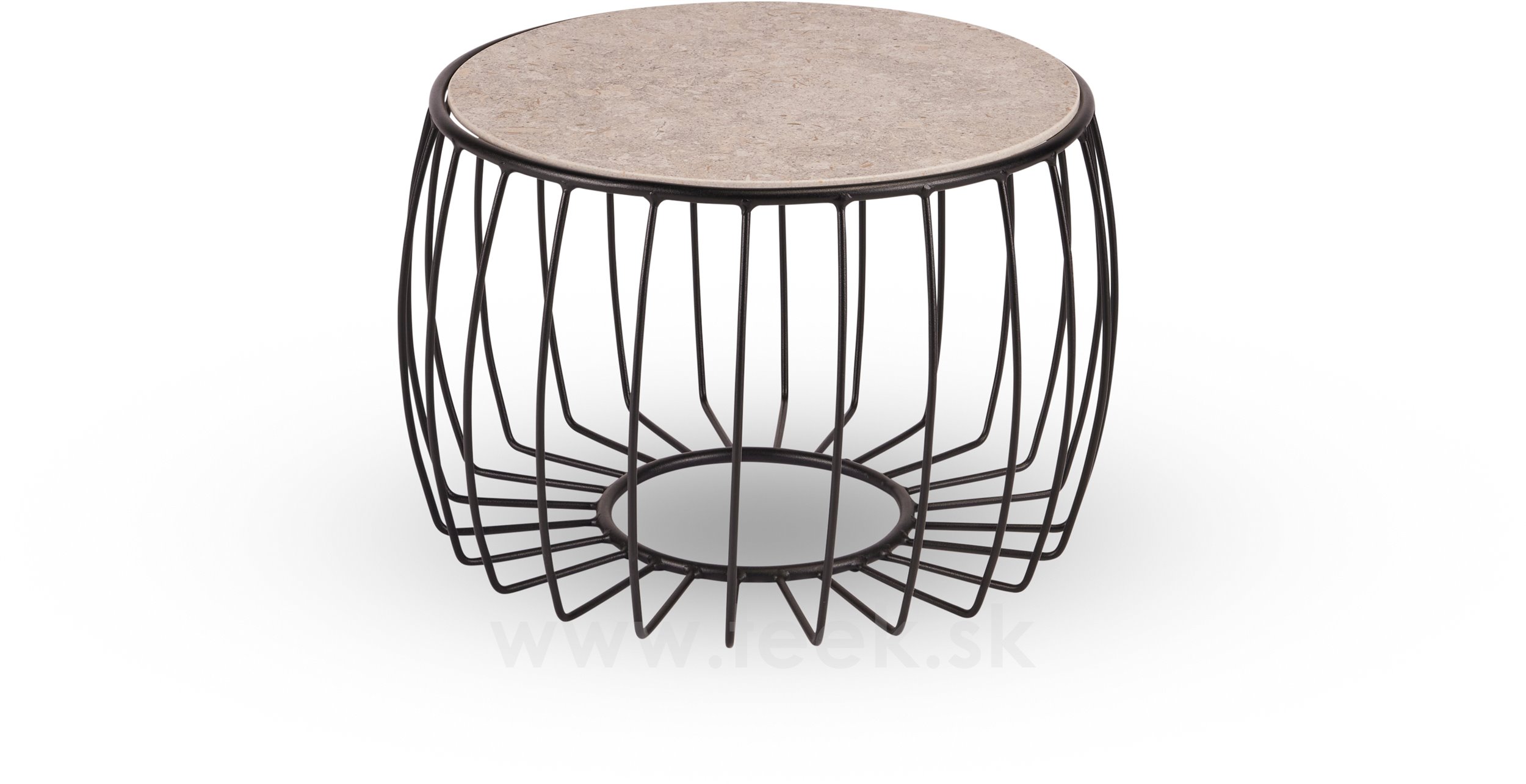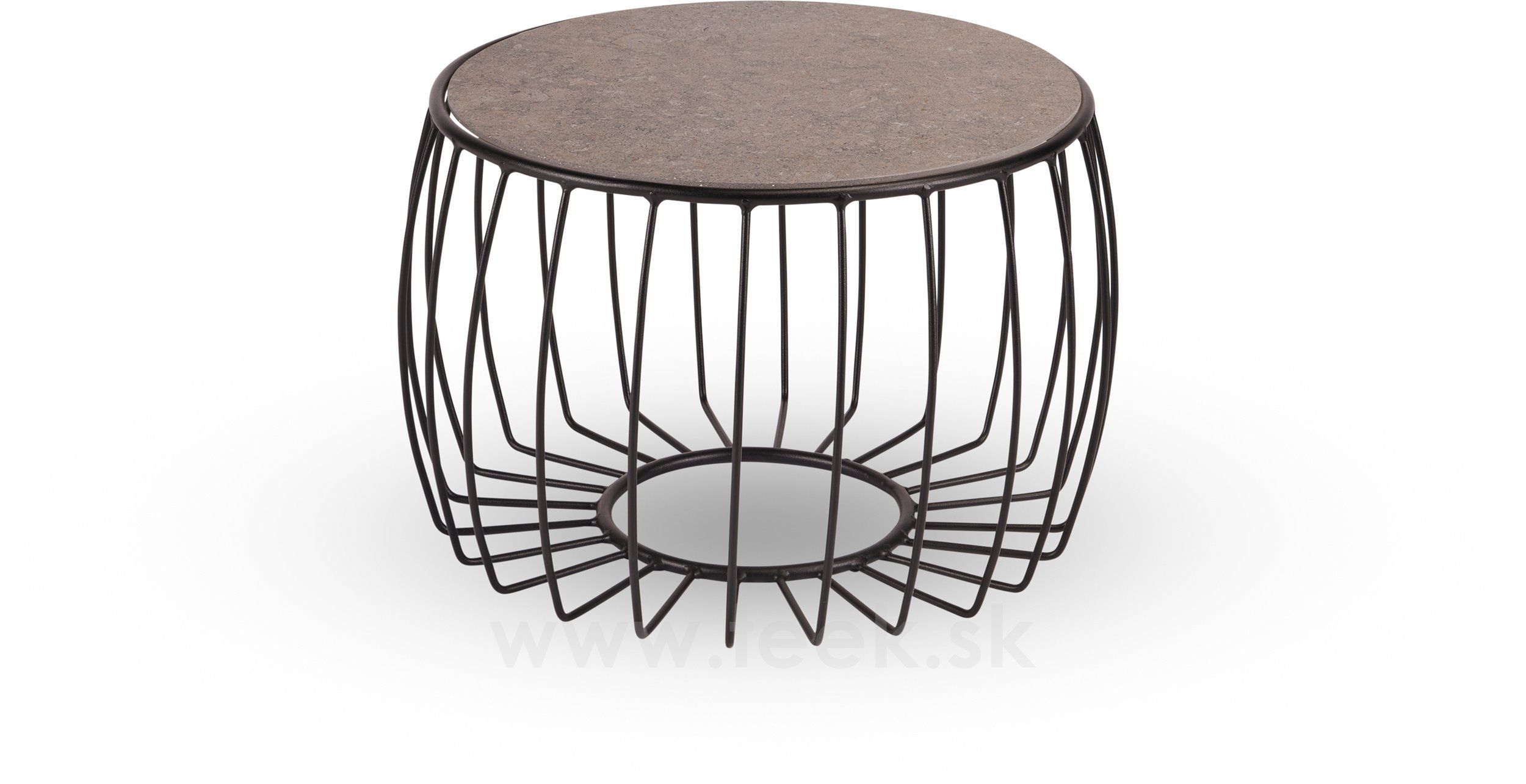 Coffee table Oxo, Stern, round 57x37 cm, top diameter 48 cm, black matt painted aluminium frame, ceramic top decor Stone grey