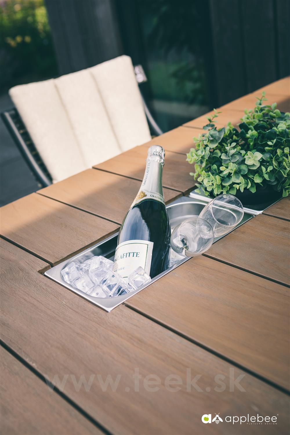 Ve středu stolu jsou 2 kovové nádoby s krytem, které je možné použít například jako nádoba na led s pitím.