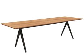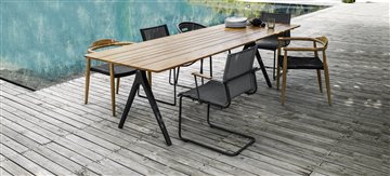 Designový venkovní jídelní stůl Split značky Gloster má praktickou podnož, díky tomu lze využít plnou délku stolu pro sezení.