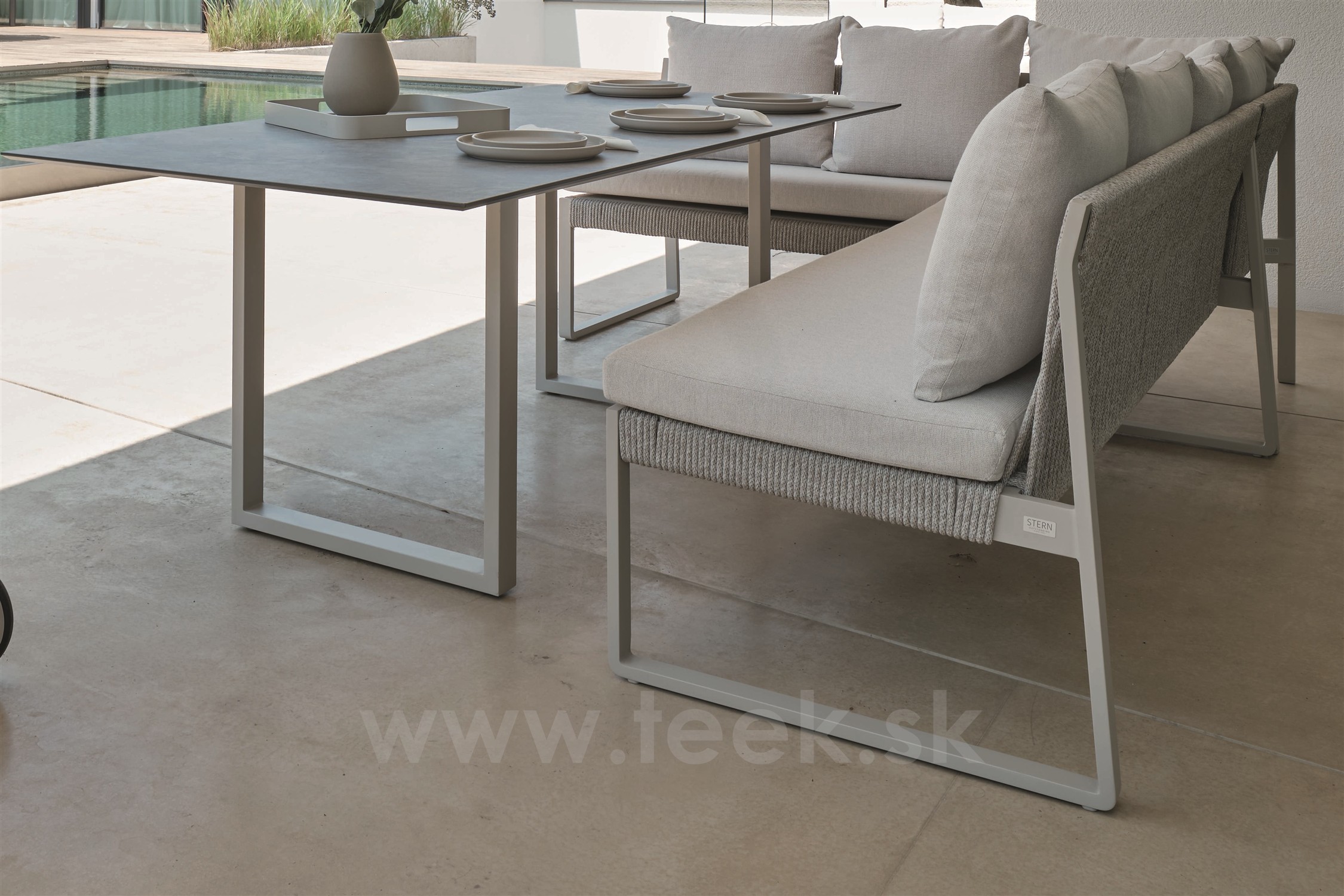 2-místná jídelní lavice Tammo, Stern, 110x75x85 cm, rám lakovaný hliník greige, výplet lanko greige, sedáky 100% akryl Pearl Grey