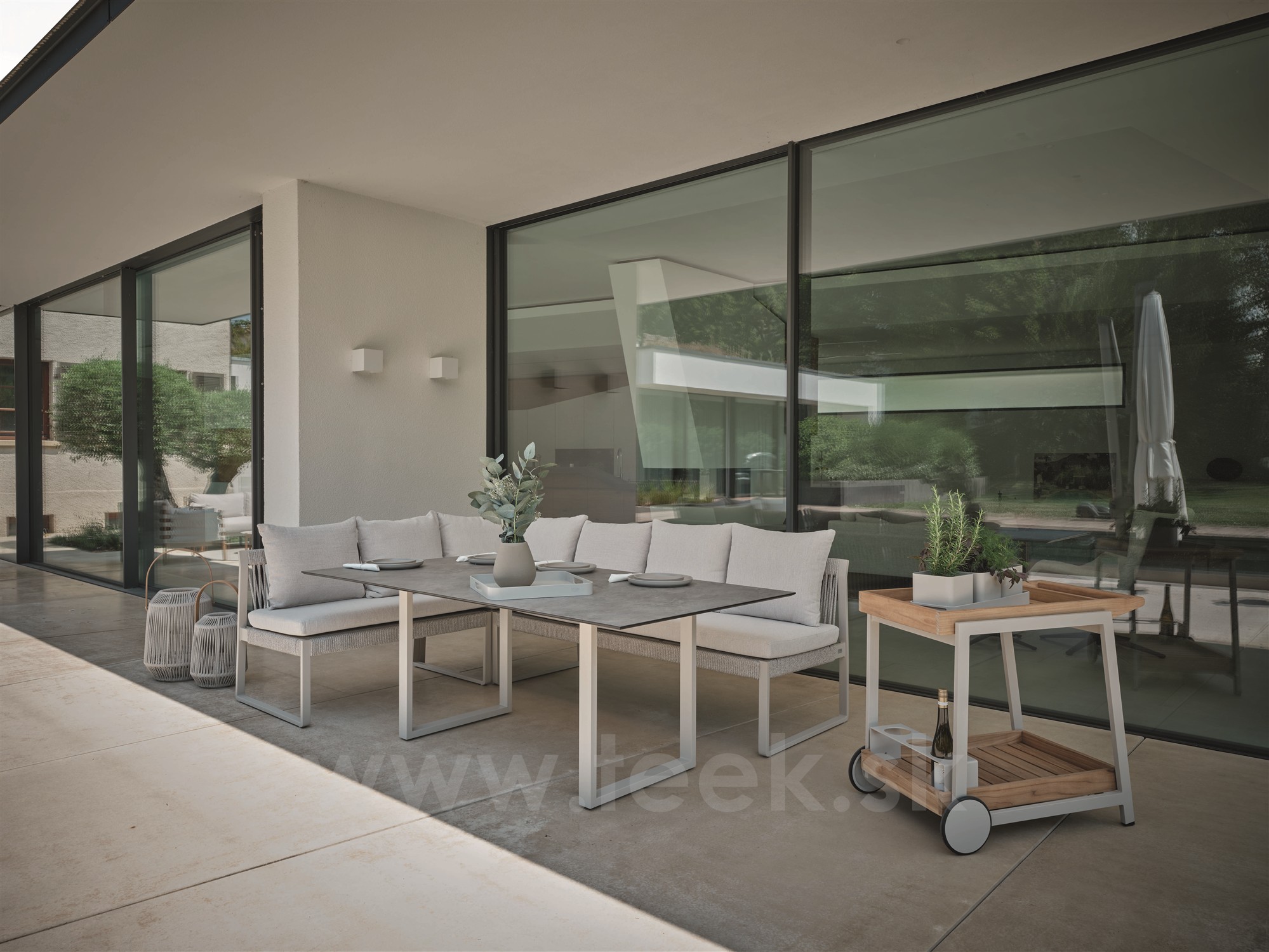 2-místná jídelní lavice Tammo, Stern, 110x75x85 cm, rám lakovaný hliník greige, výplet lanko greige, sedáky 100% akryl Ivory