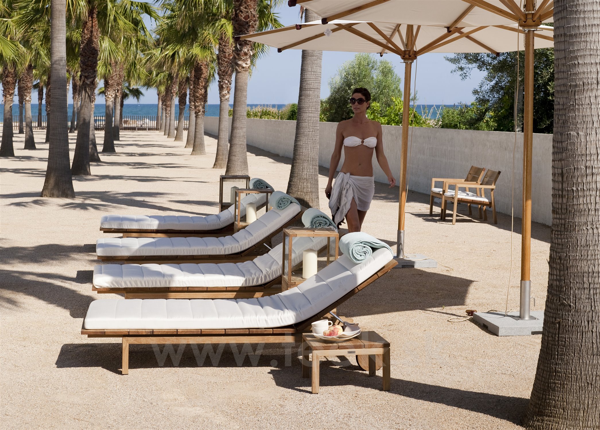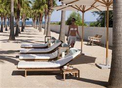 Tribu's Kos Teak exteriérové ležadlo s kolieskami vyrobené z masívneho teakového dreva. Opierka chrbta je nastaviteľná, ležadlo obsahuje veľké kolieska. Pre väčšie pohodlie odporúčame objednať celopotiahnutú vonkajšiu odolnú látku s rýchloschnúcou penovou výplňou.