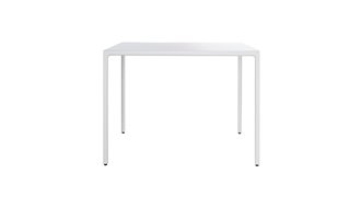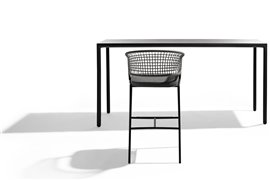 Barový venkovní stůl Illum značky Tribu má rám z lakovaného hliníku a desku stolu z teakového masivu nebo keramiky v různých dekorech