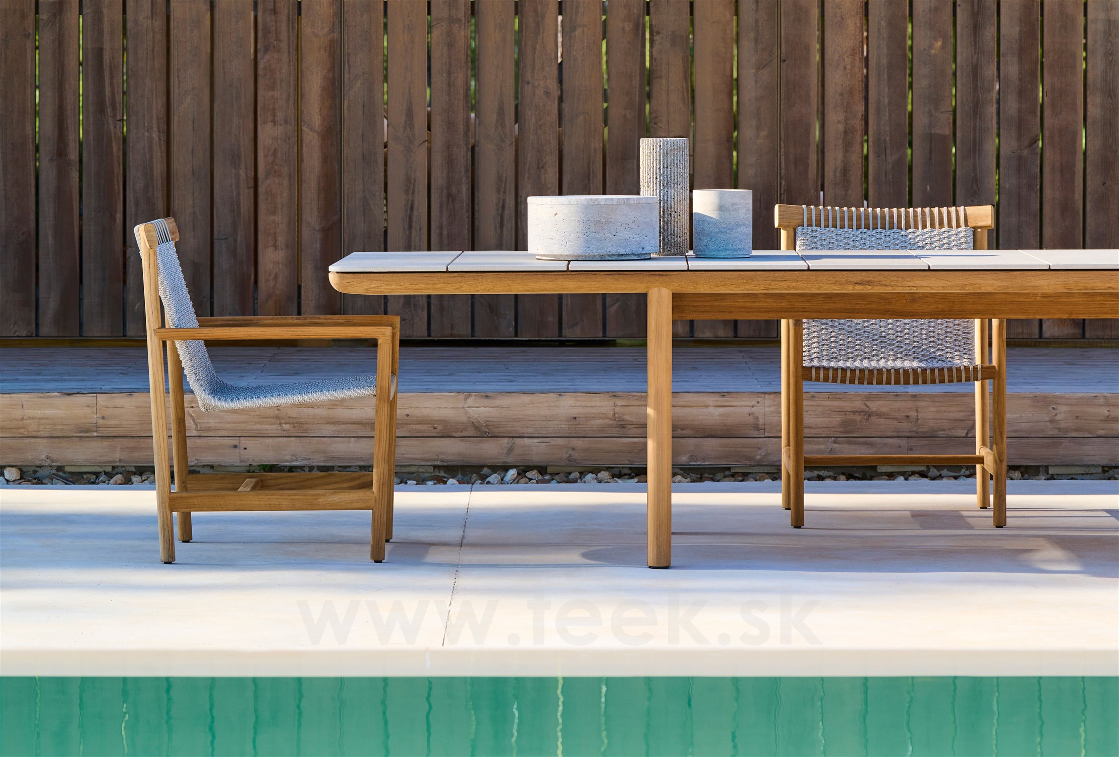 Obdĺžnikový vonkajší jedálenský stôl Amanu od spoločnosti Tribu. Rám stola je vyrobený z teakového dreva. Keramická doska je k dispozícii v dvoch dekoroch.