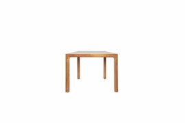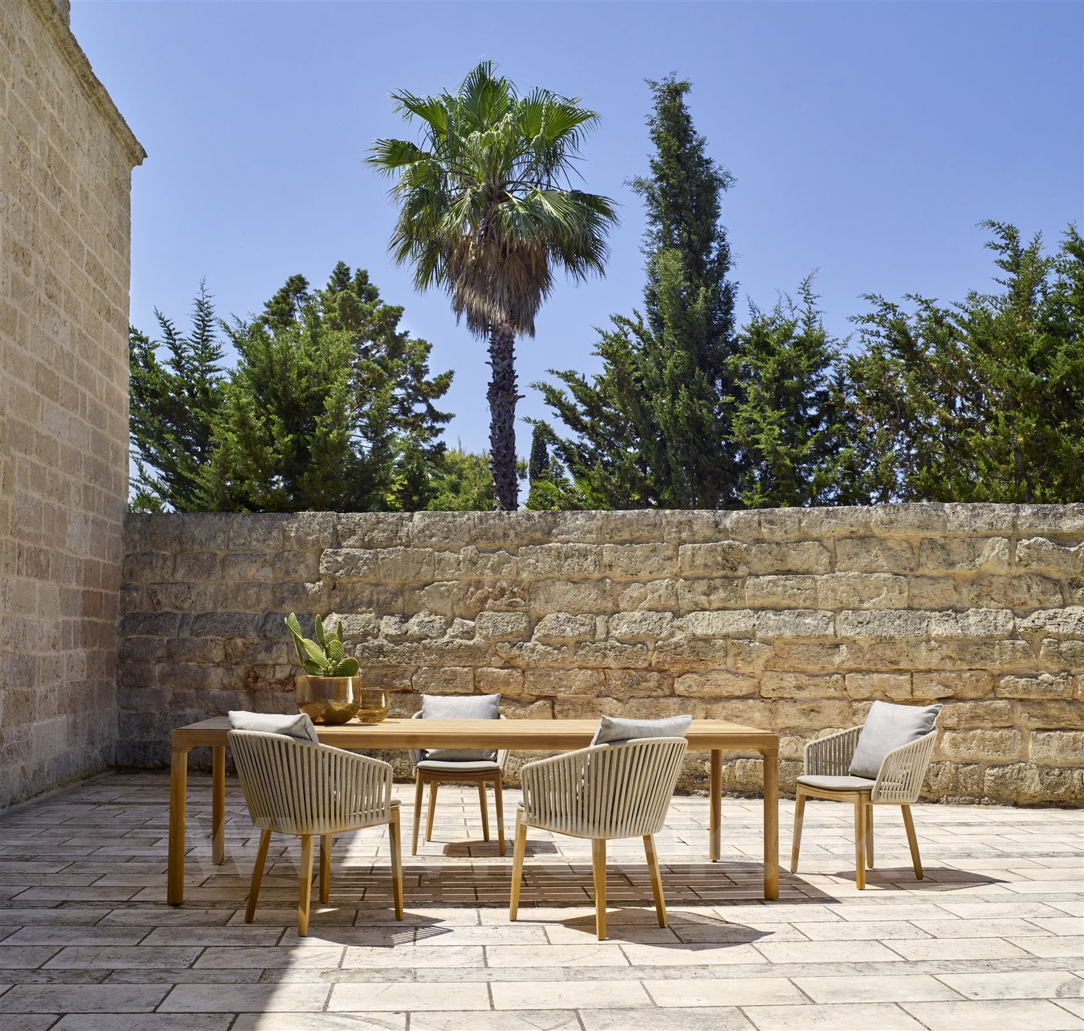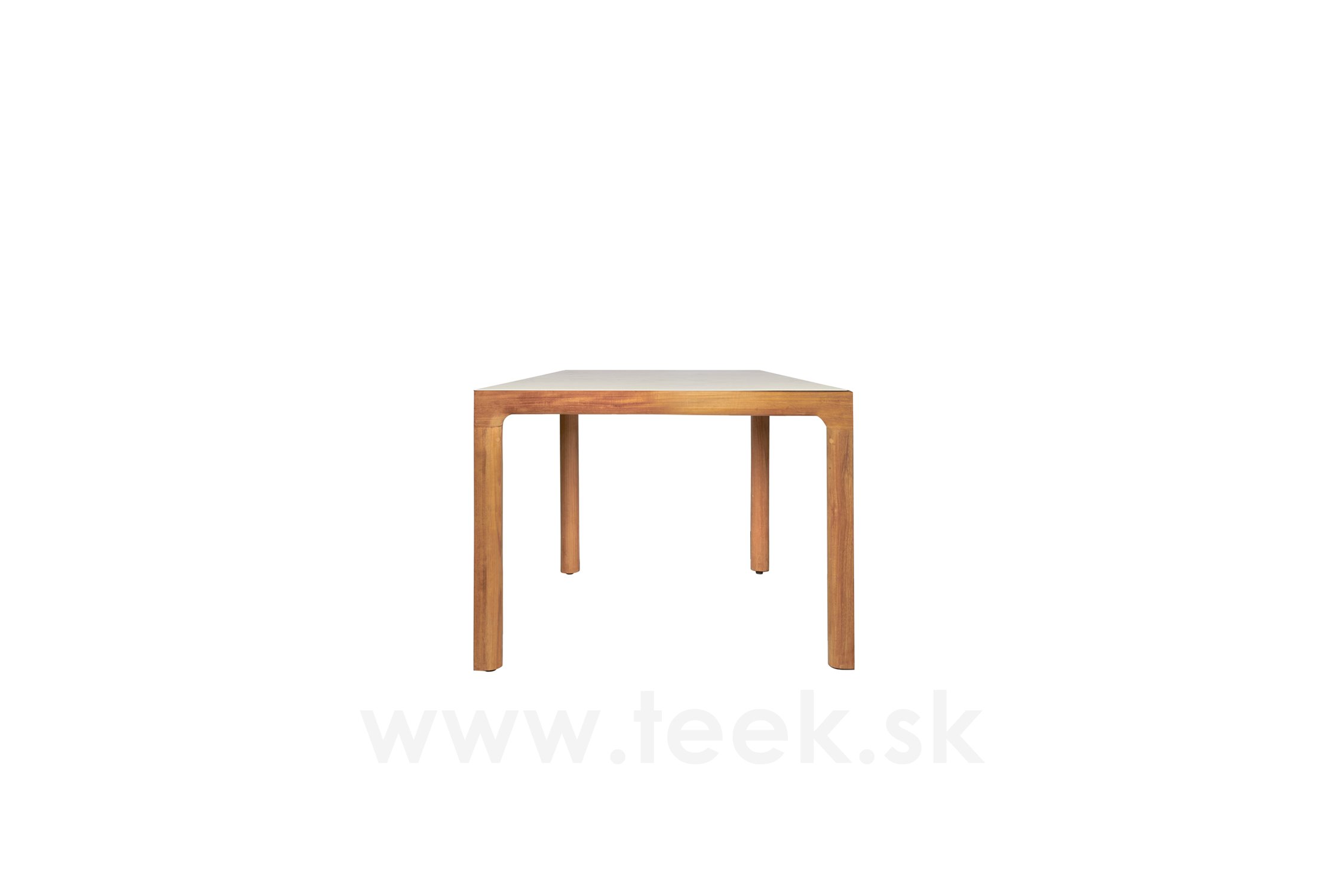 Vonkajší jedálenský stôl Illum od spoločnosti Tribu z teakového dreva, stolová doska z teakového dreva alebo keramiky v rôznych dekoroch. K dispozícii vo viacerých farbách rámu.