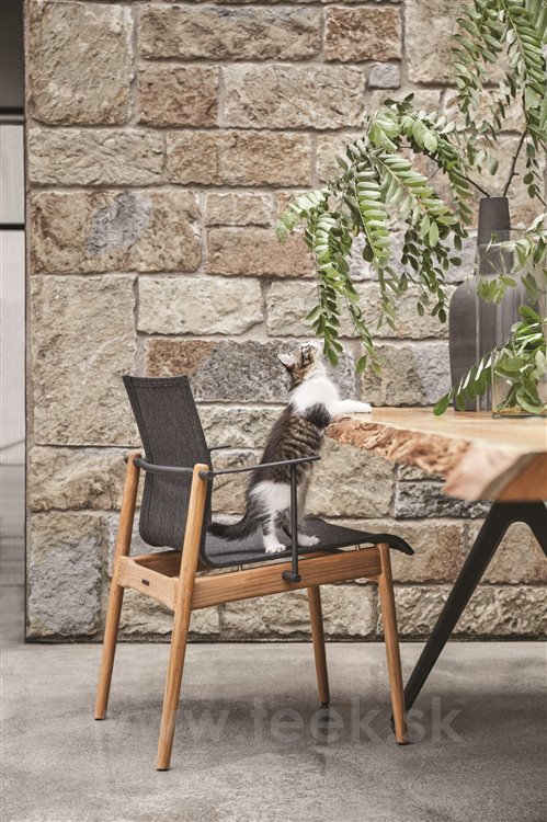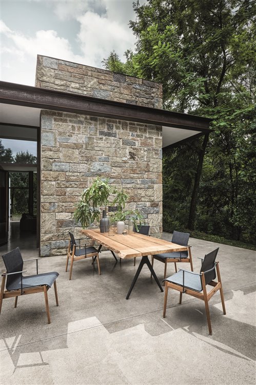 Záhradný jedálenský stôl Raw by Gloster. Rám jedálenského stola je vyrobený z lakovaného hliníka, doska jedálenského stola je z masívneho teakového dreva.
