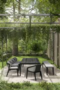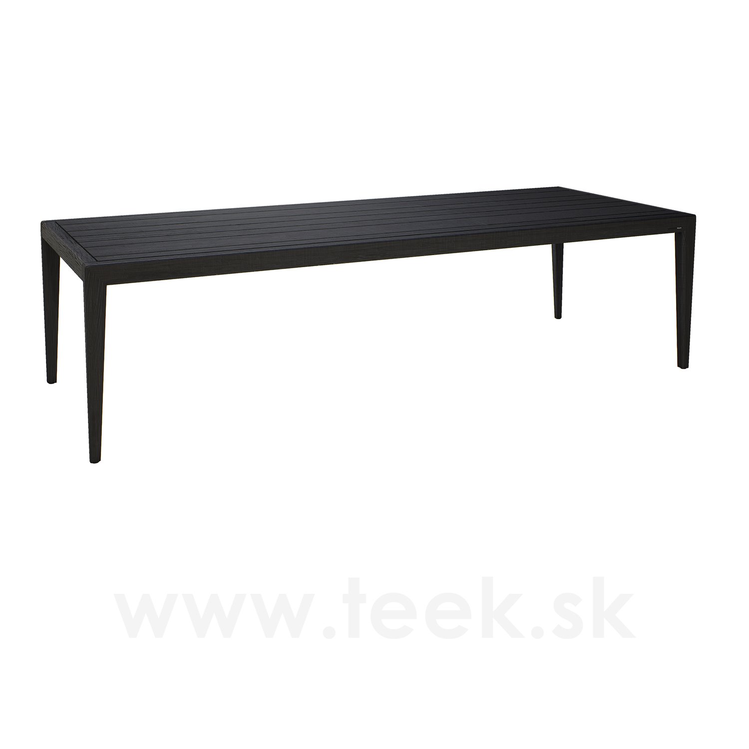 Obdélníkový venkovní jídelní stůl Sunrise značky Manutti. Stůl je vyroben z přírodního nebo černě mořeného teakového dřeva.