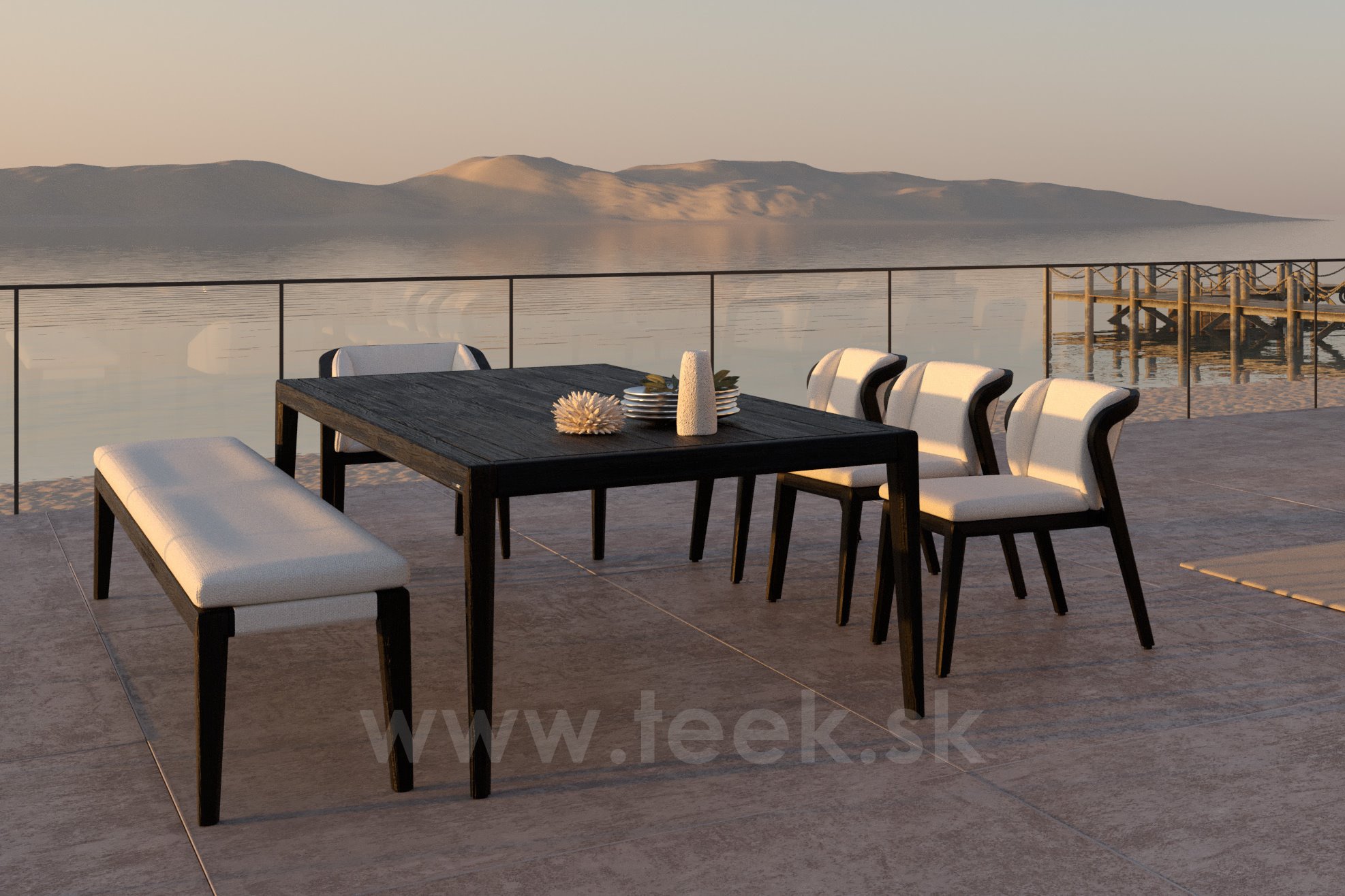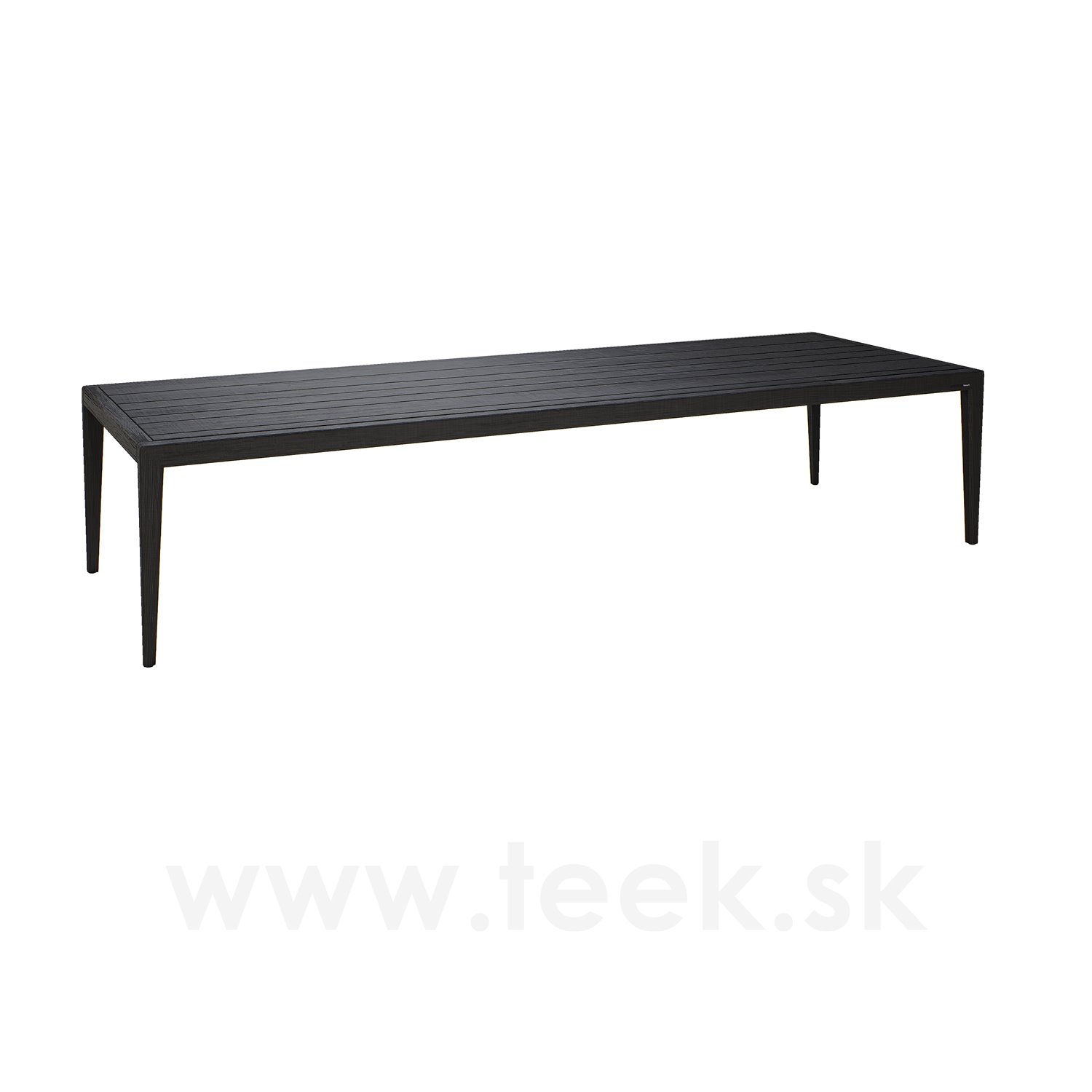 Obdélníkový venkovní jídelní stůl Sunrise značky Manutti. Stůl je vyroben z přírodního nebo černě mořeného teakového dřeva.