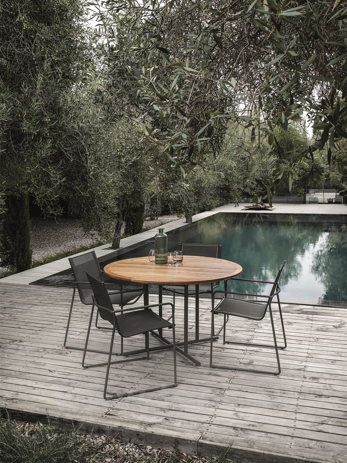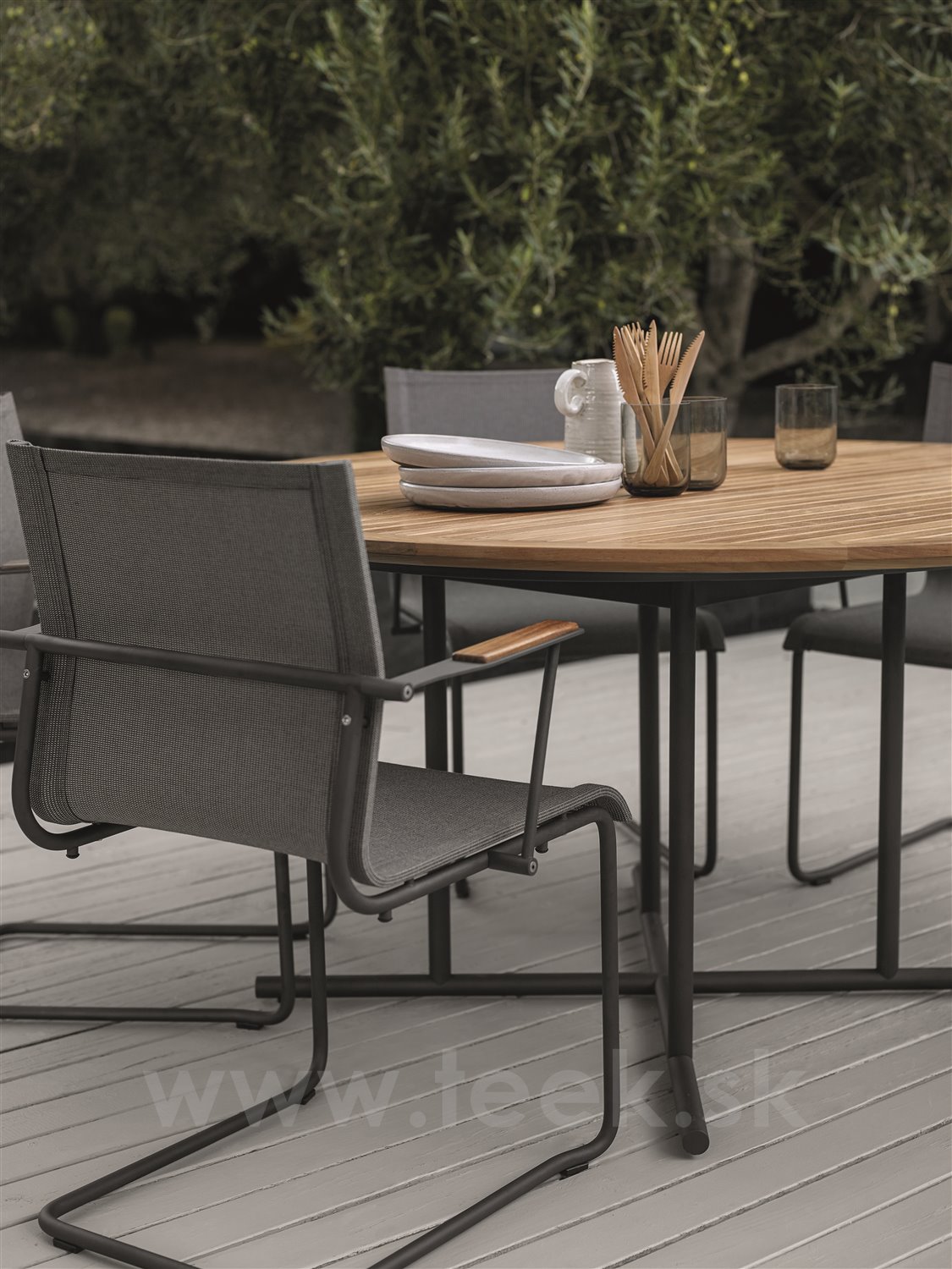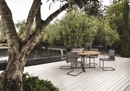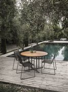 Elegantní kulatý minimalistický venkovní jídelní stůl Whirl značky Gloster má designově zajímavou a praktickou podnož.