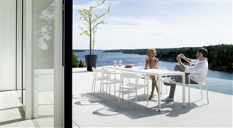 Vonkajší jedálenský stôl Illum od spoločnosti Tribu z lakovaného hliníka, stolová doska z masívneho teakového dreva alebo keramiky v rôznych dekoroch.