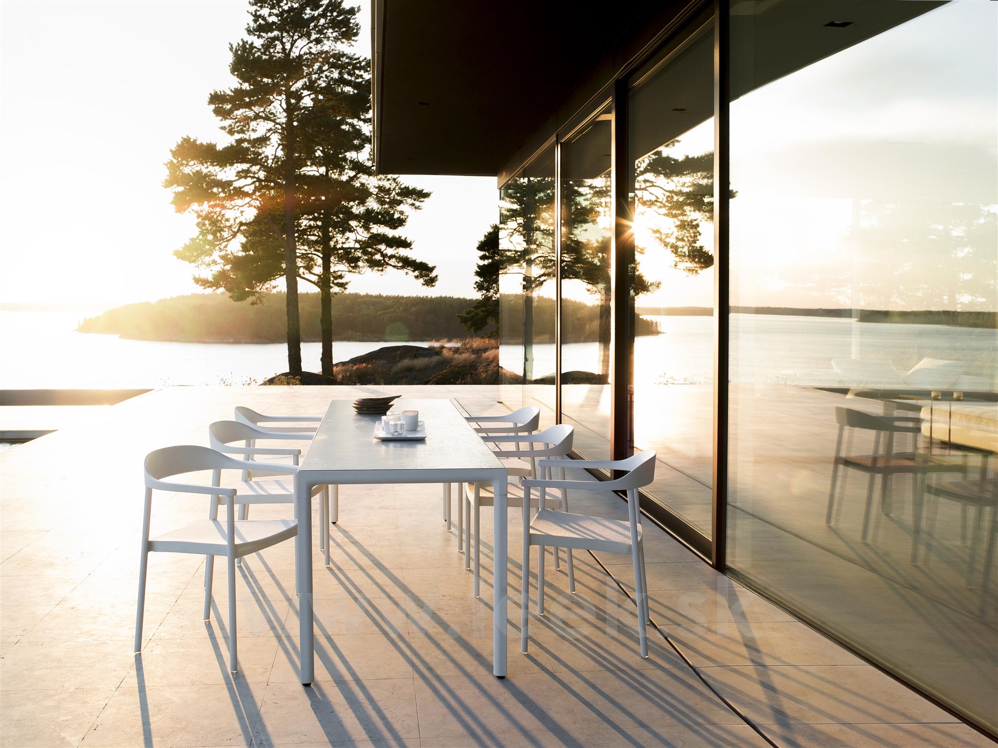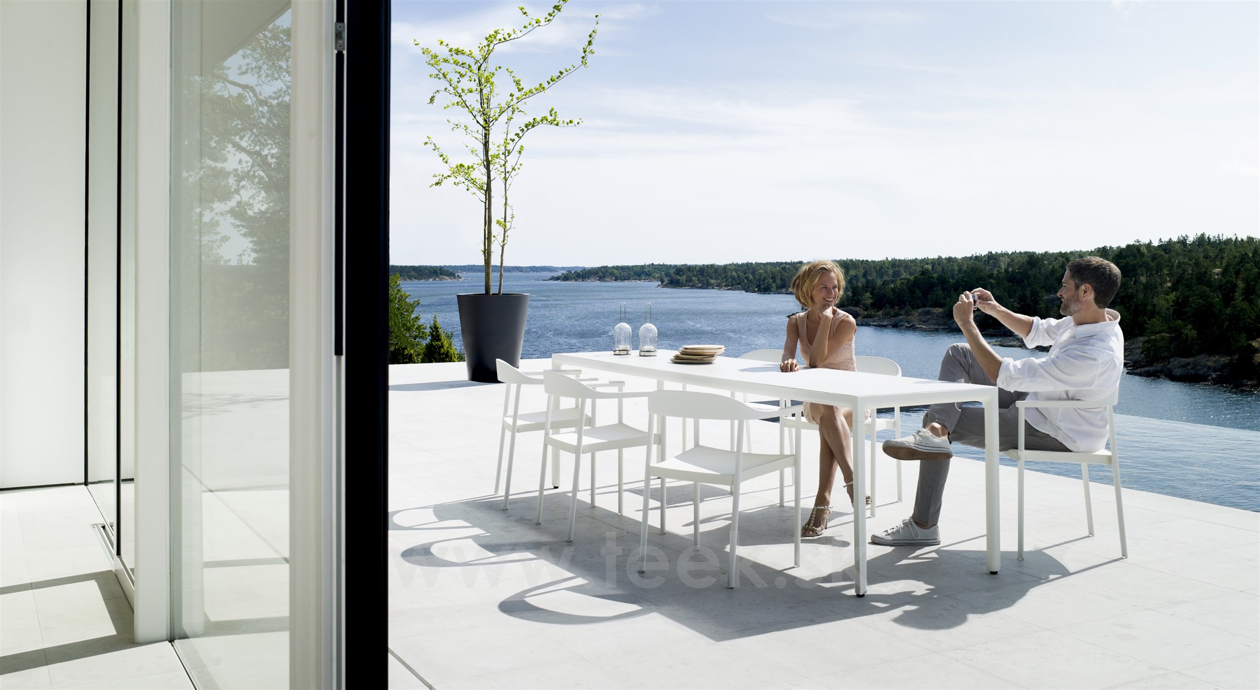 Vonkajší jedálenský stôl Illum od spoločnosti Tribu z lakovaného hliníka, stolová doska z masívneho teakového dreva alebo keramiky v rôznych dekoroch.