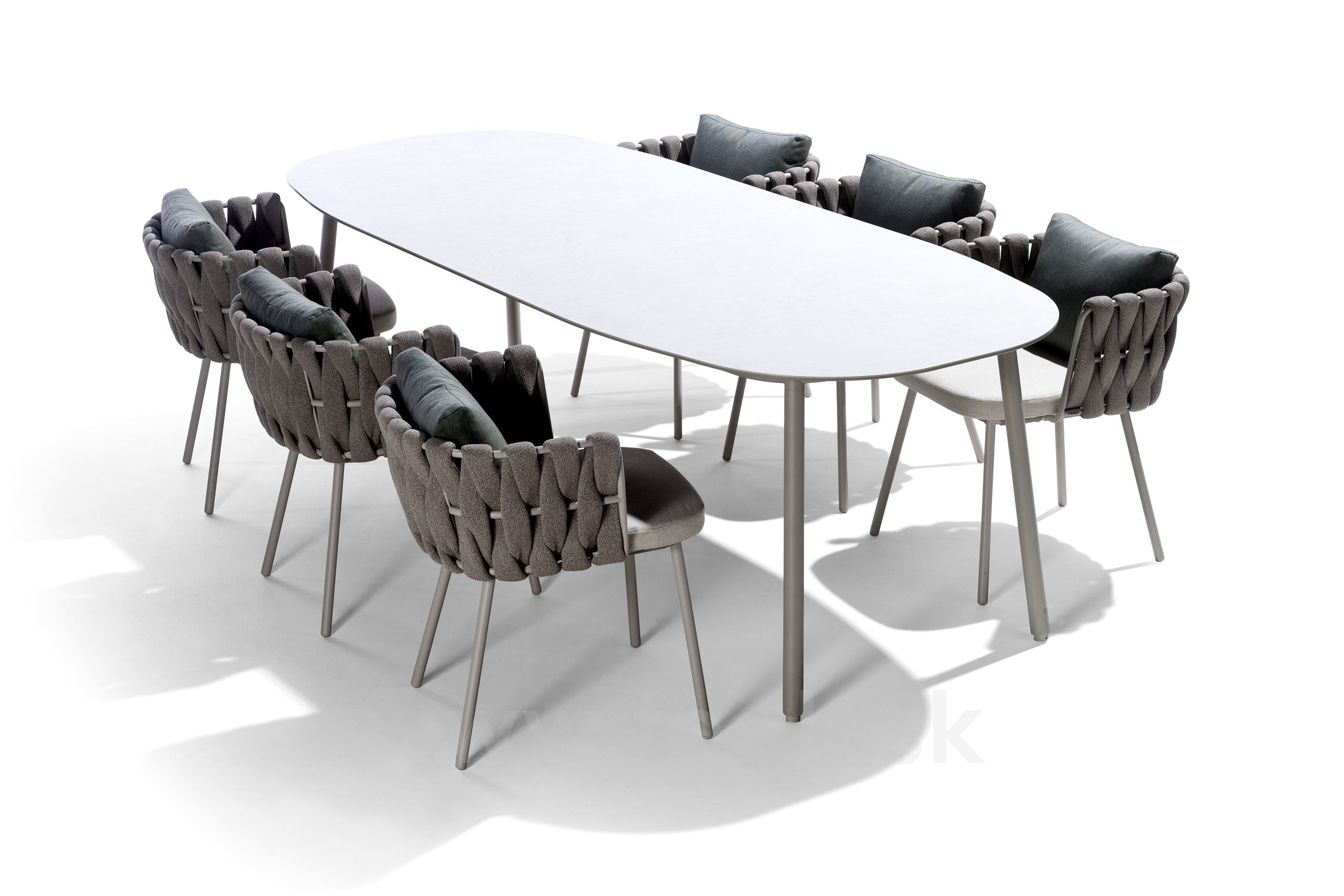 Vonkajší jedálenský stôl Tosca od spoločnosti Tribu s rámom z lakovanej nehrdzavejúcej ocele a keramickou stolovou doskou.