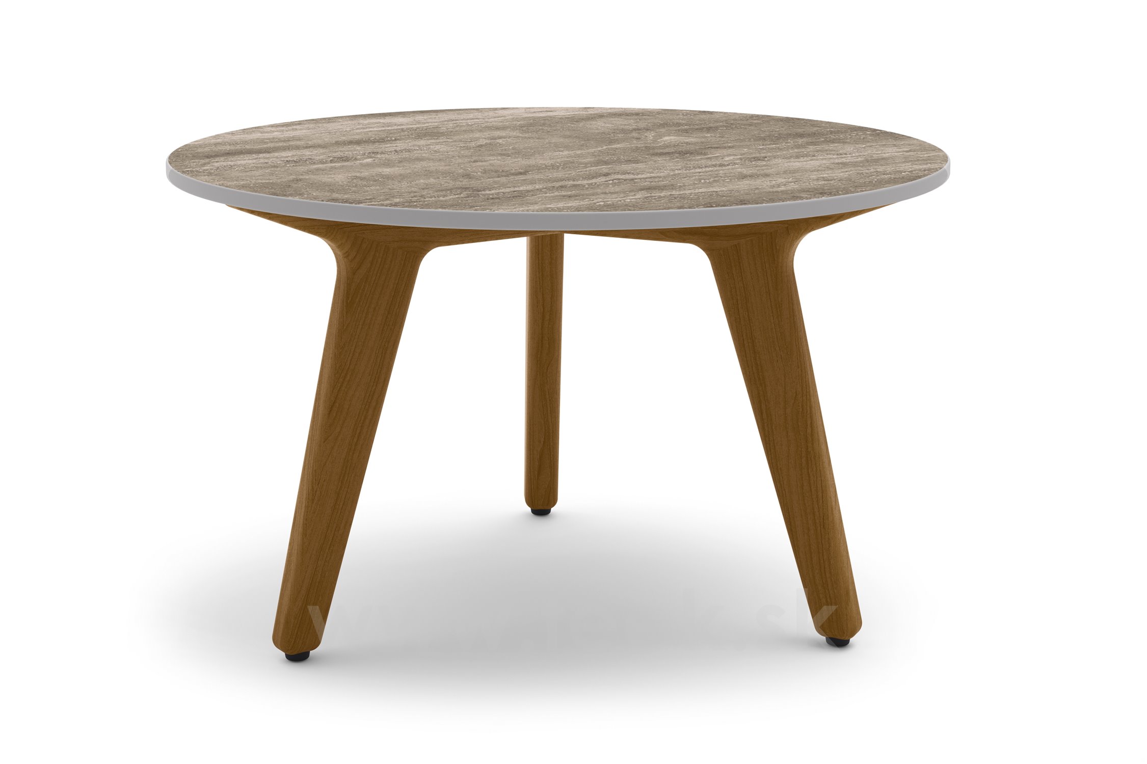 Nízký stolek Torsa, Manutti, kulatý prům. 60x35 cm, rám teak, deska keramika 12 mm, dekor travertin geo