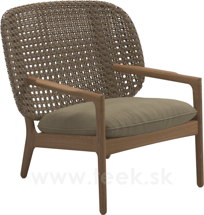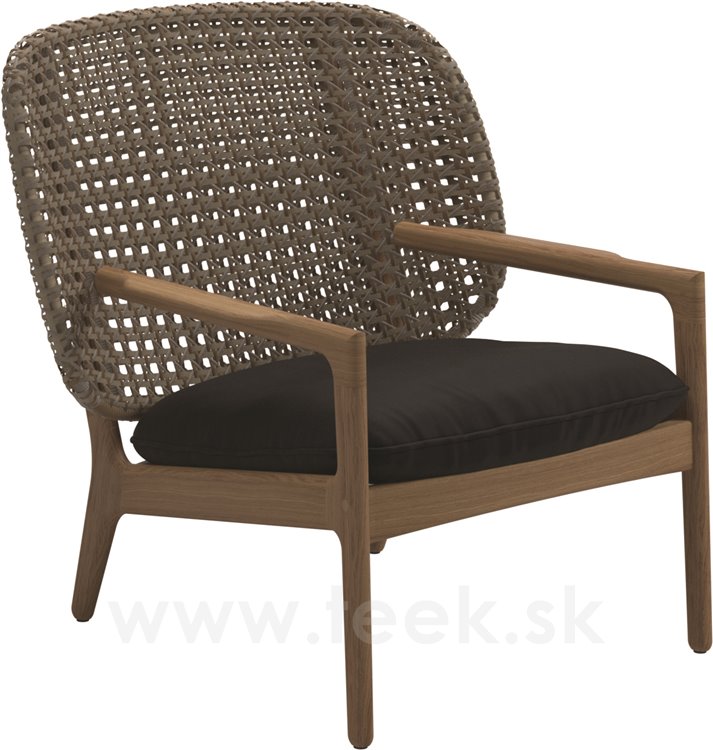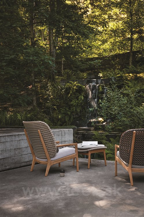 Záhradné nízke kreslo Kay od spoločnosti Gloster. Záhradné kreslo má leštený teakový rám v kombinácii s výpletom z umelého ratanu. Sedadlo je vyrobené z vonkajších látok vhodných na celoročné použitie.