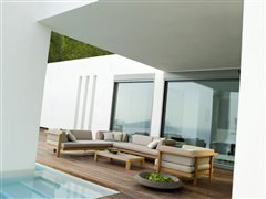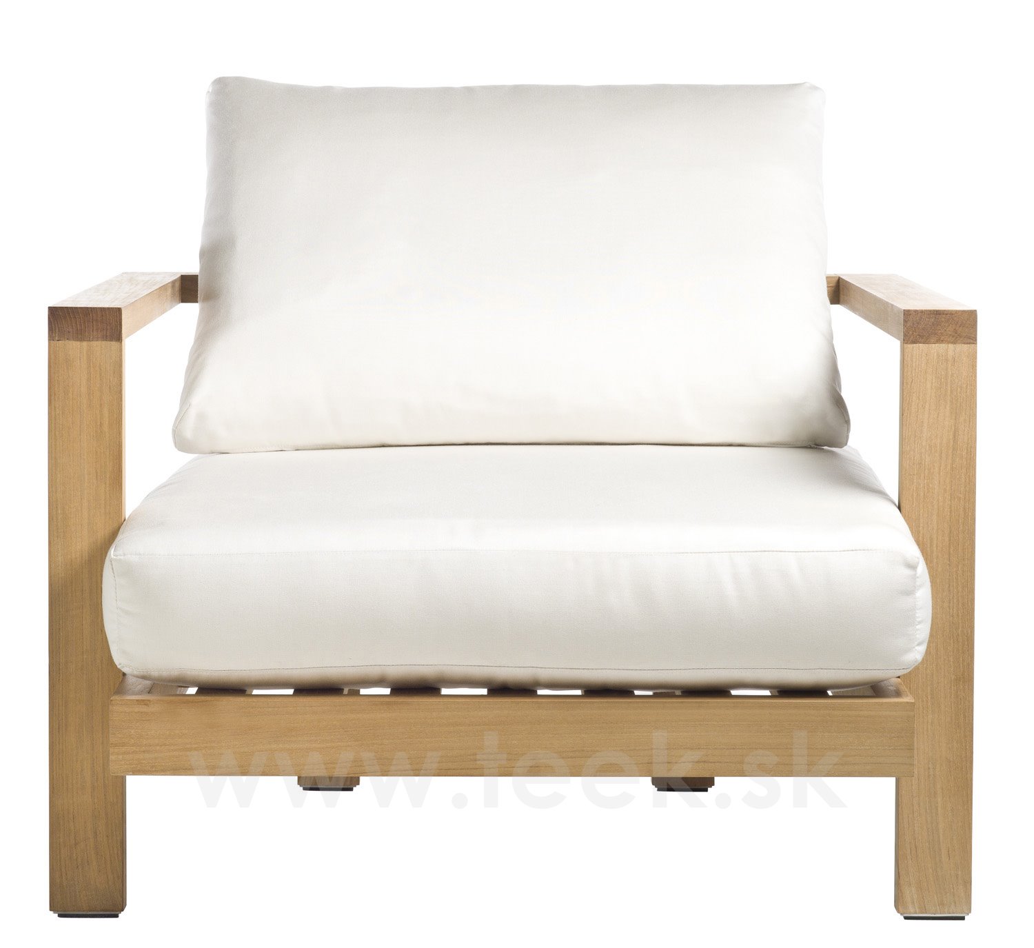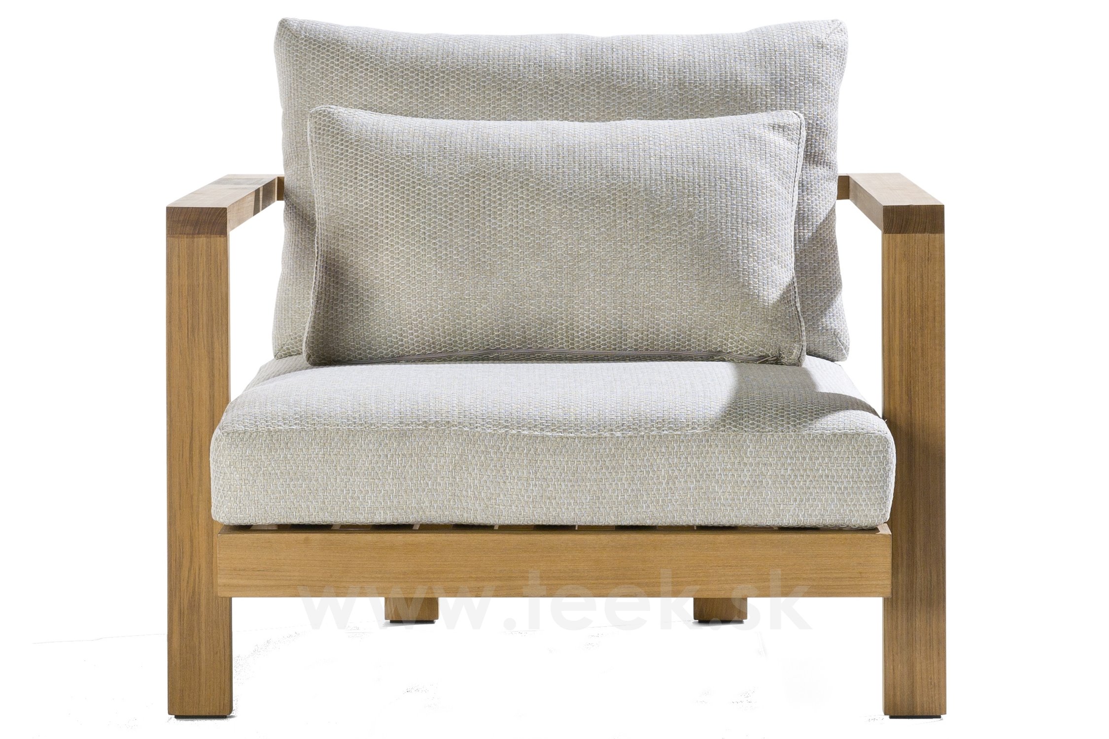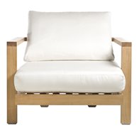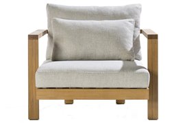 Venkovní nízké křeslo Pure značky Tribu. Rám venkovního křesla je z teakového masivu.
