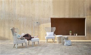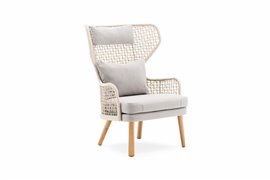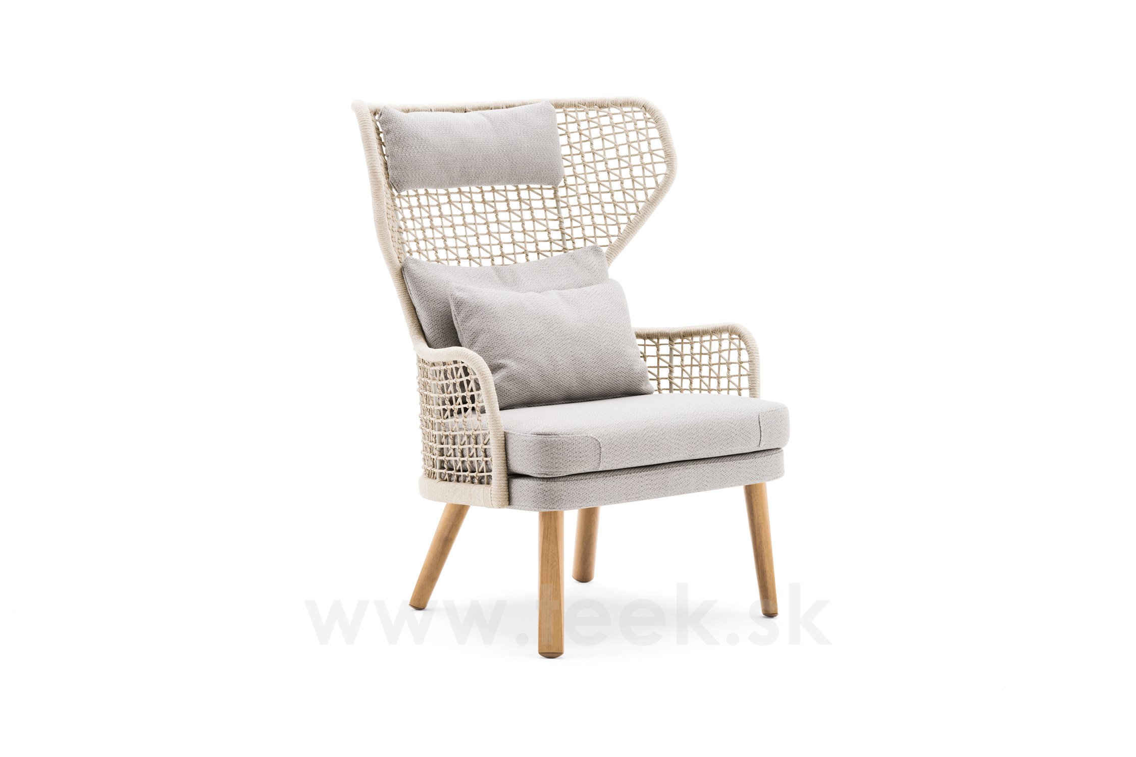 Nízké křeslo s vysokou zádovou opěrkou Emma, Varaschin, 83x79x108 cm, nohy iroko, výplet lanko, sedák, 1 opěrný polštář a 1 podhlavník venkovní látka kat. E, barvy dle vzorníku